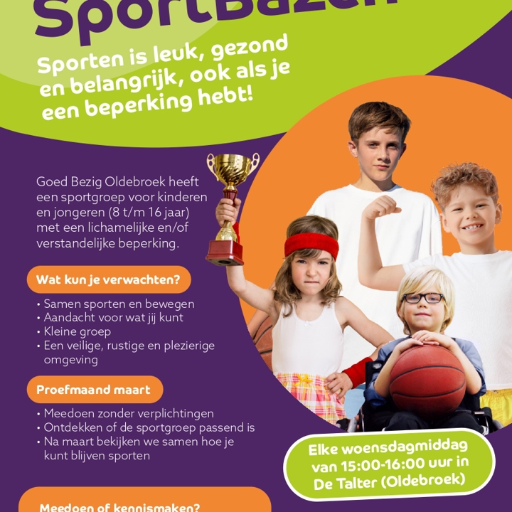 Goed Bezig Oldebroek heeft een sportgroep voor kinderen en jongeren (8 t/m 16 jaar) met een lichamelijke en/of verstandelijke beperking. Tijdens de maand maart kun je vrijblijvend proefdraaien in deze sportgroep. Samen kijken we of deze groep bij je past! Voor meer informatie zie de flyer of bekijken onze webpagina over SportBazen