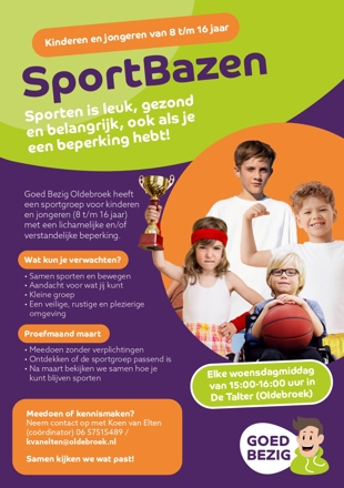 Sporten is leuk, gezond én voor iedereen. Ook voor kinderen en jongeren met een lichamelijke en/of verstandelijke beperking. Daarom organiseert Goed Bezig Oldebroek in de maand maart een proefmaand bij SportBazen.